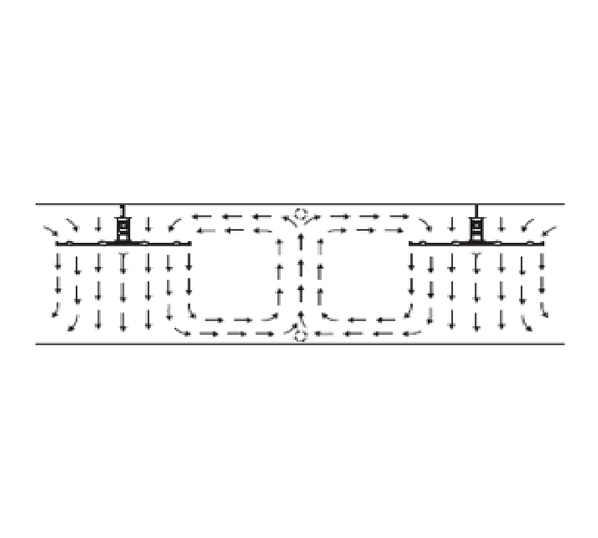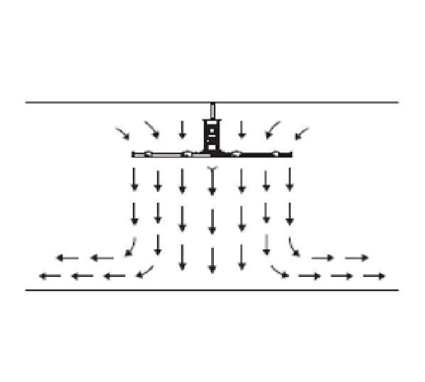 氣流到達(dá)地面后偏轉(zhuǎn)向外輻射, 氣流遇到墻或設(shè)備阻擋物,氣流開始向上偏轉(zhuǎn)達(dá)到屋頂, 向上的氣流向風(fēng)扇上方的低壓區(qū)域然后在將其拉向地板。這個(gè)類似對(duì)流。
