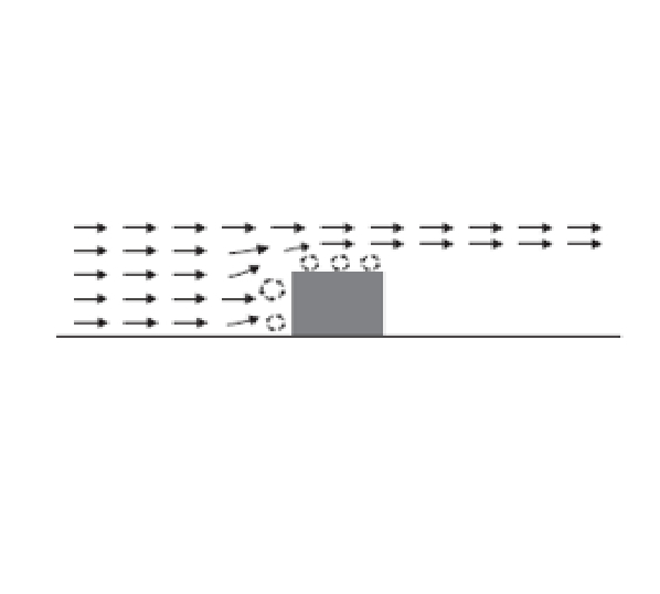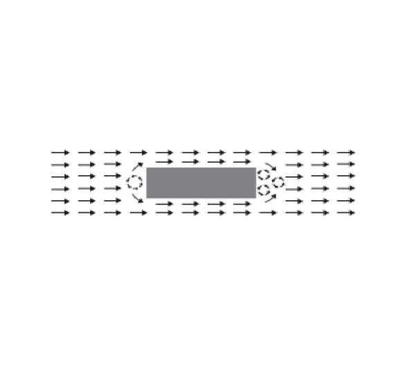 地面的障礙物會(huì)阻礙空氣流動(dòng), 小的或流線型障礙物不會(huì)阻塞太多的空氣流動(dòng), 但當(dāng)氣流遇到大的障礙物,氣流會(huì)失去部分動(dòng)力,并在部分區(qū)域產(chǎn)生空氣停滯(沒有風(fēng))。氣流通過大障礙物,空氣流會(huì)改變方向向上, 障礙物后面將不會(huì)有氣流通過。